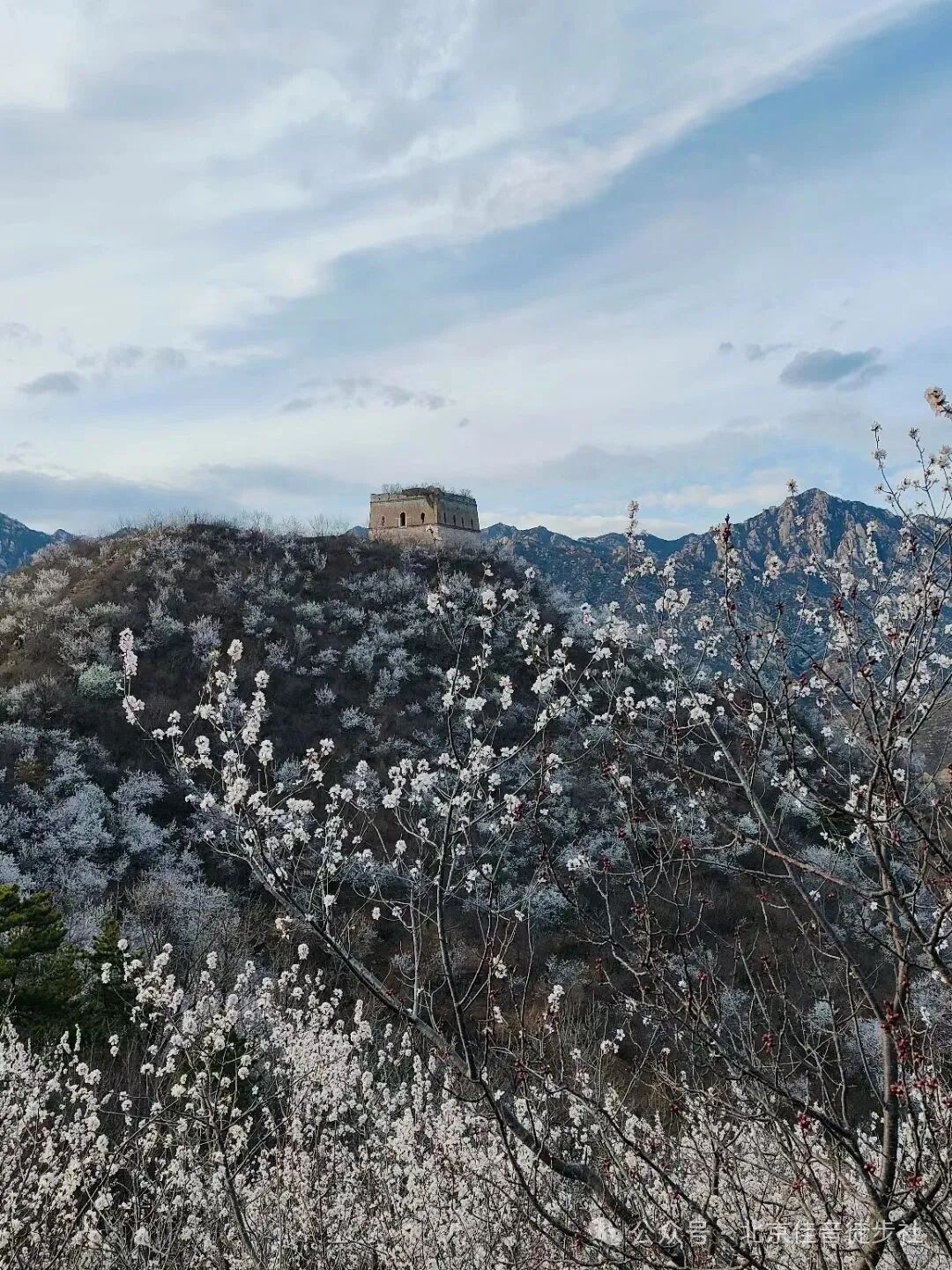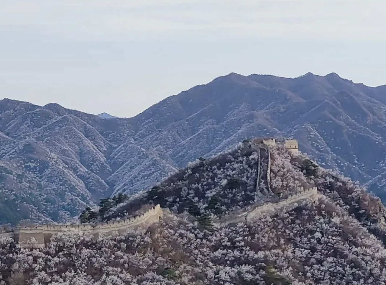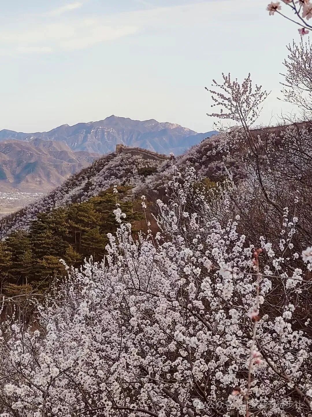 3月正值桃花盛放期,撞道口长城被粉白花海环绕,登高俯瞰如“花毯覆龙”。